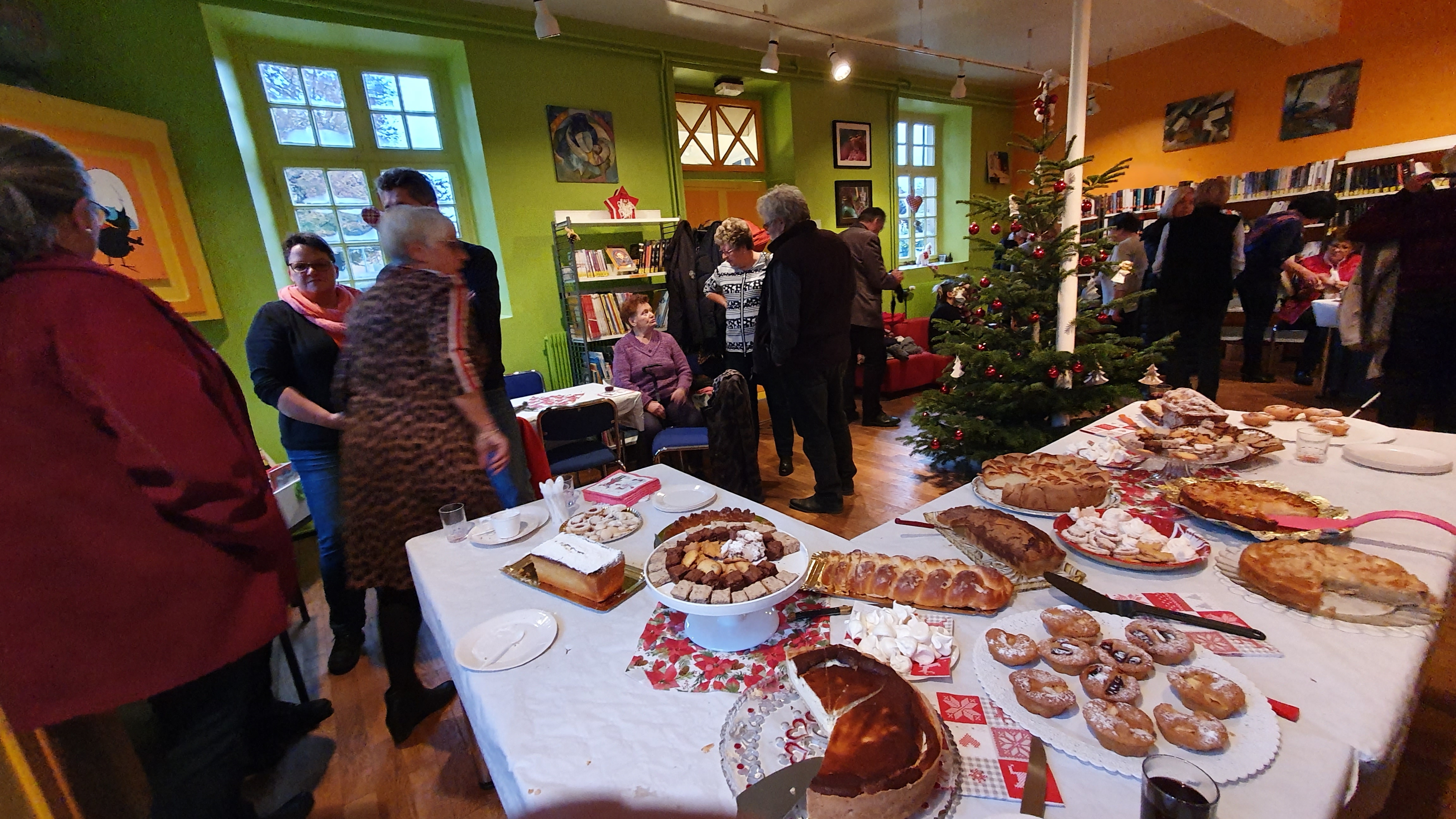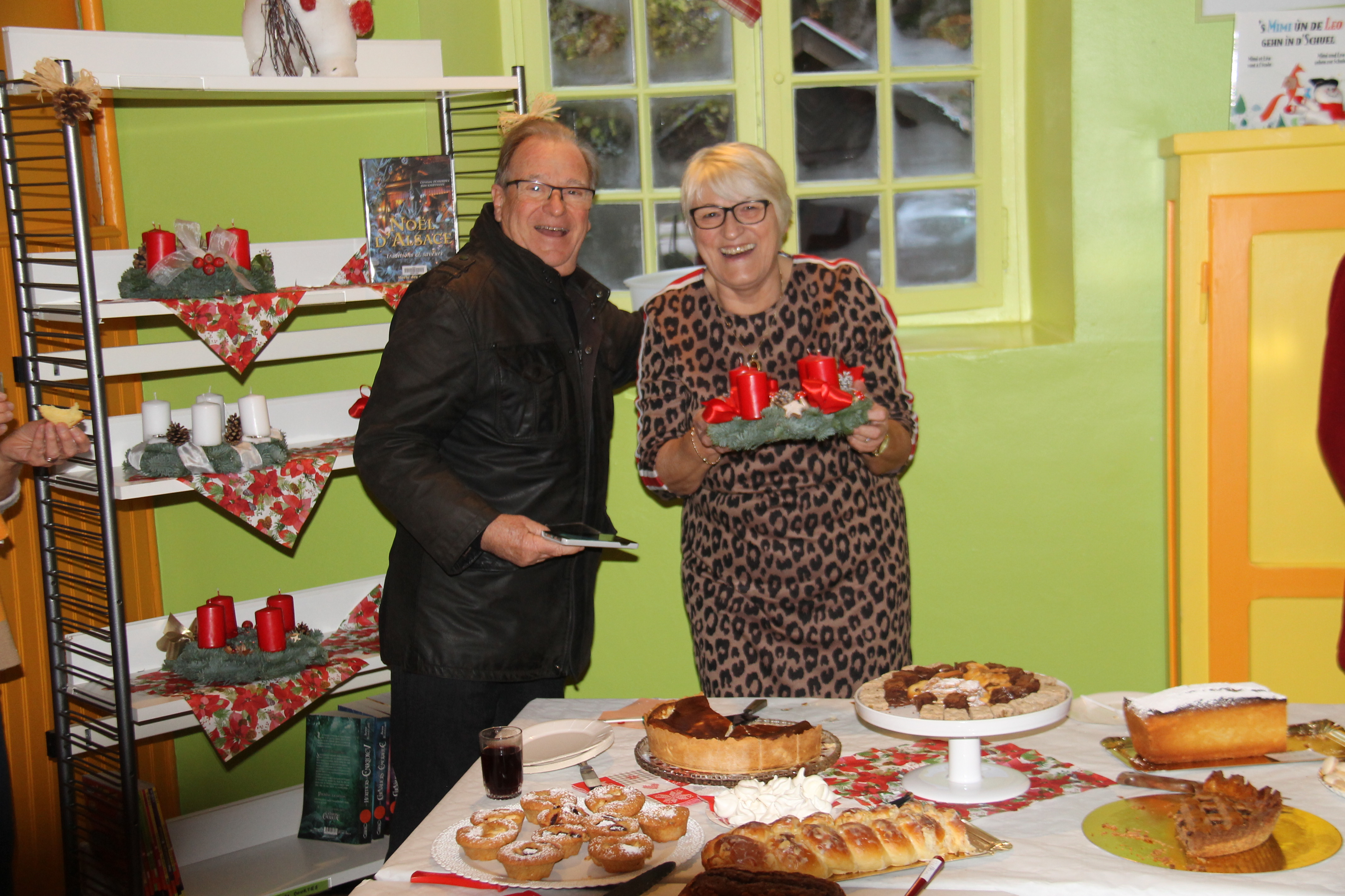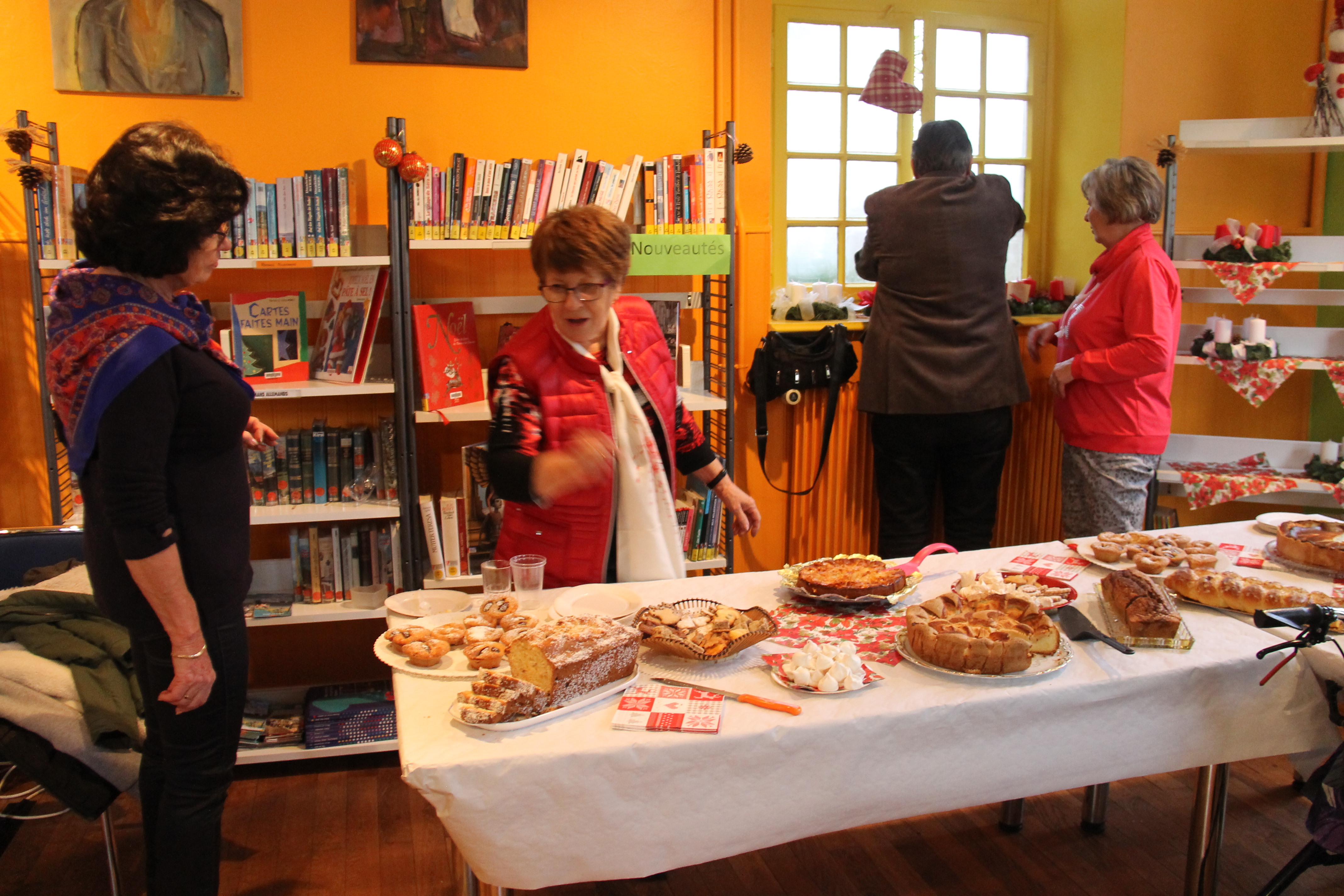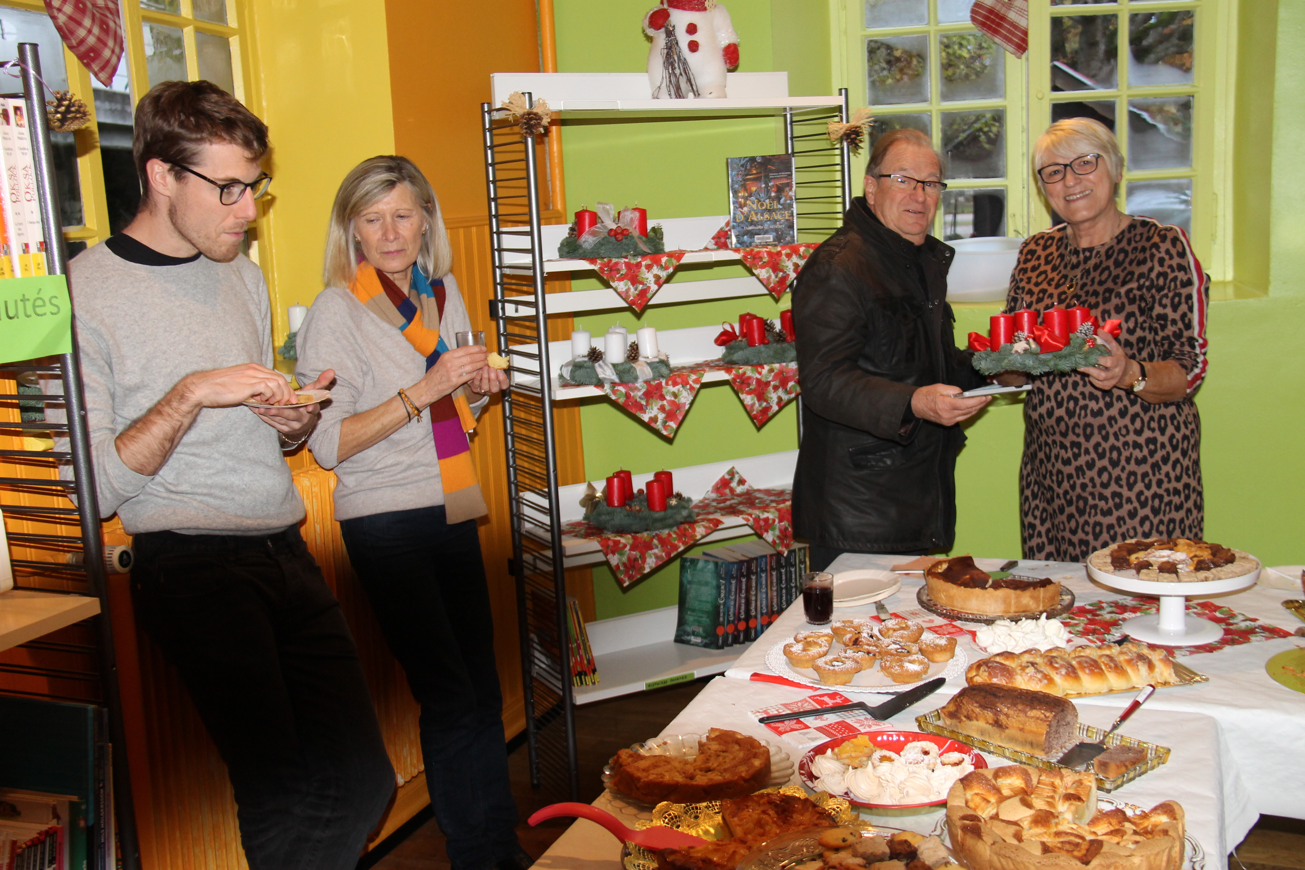 Au programme de l’après midi festive, on pouvait siroter un verre de vin chaud au détour d’une table riche en pâtisseries et bredele de Noël ou alors choisir une jolie couronne de l’Avent parmi celles confectionnées spécialement pour l’occasion. Pour les lecteurs d’un jour ou les habitués de la bibliothèque de Handsche, l’équipe des bibliothécaires offrait la possibilité de découvrir les nouveautés en livres et donnait la possibilité de prendre une petite pause lecture – gourmande aux milieux des rayonnages aux couleurs et odeurs de Noël.